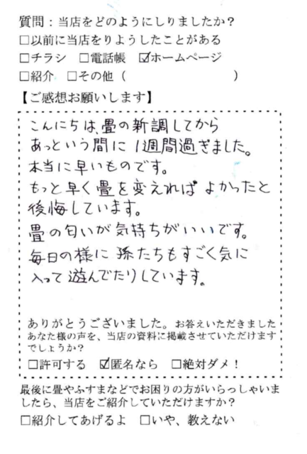 お客さんから畳替えをしたお客さんからご感想をいただきました